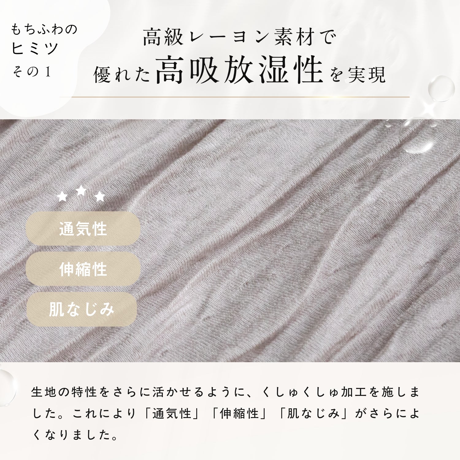 レーヨン生地の特性をさらに活かせるように、クレープのようなくしゅくしゅ加工を施しました。これにより優れた「通気性」と「肌なじみ」がさらに良くなりました。
