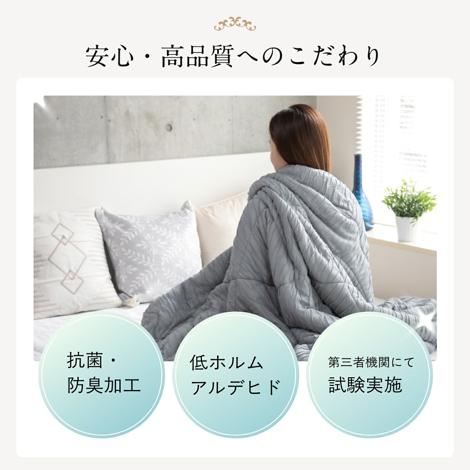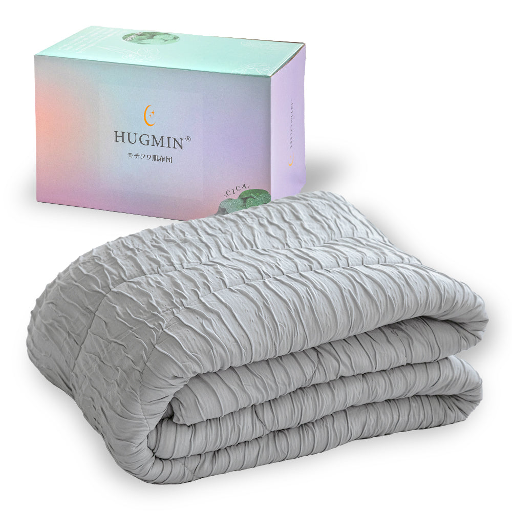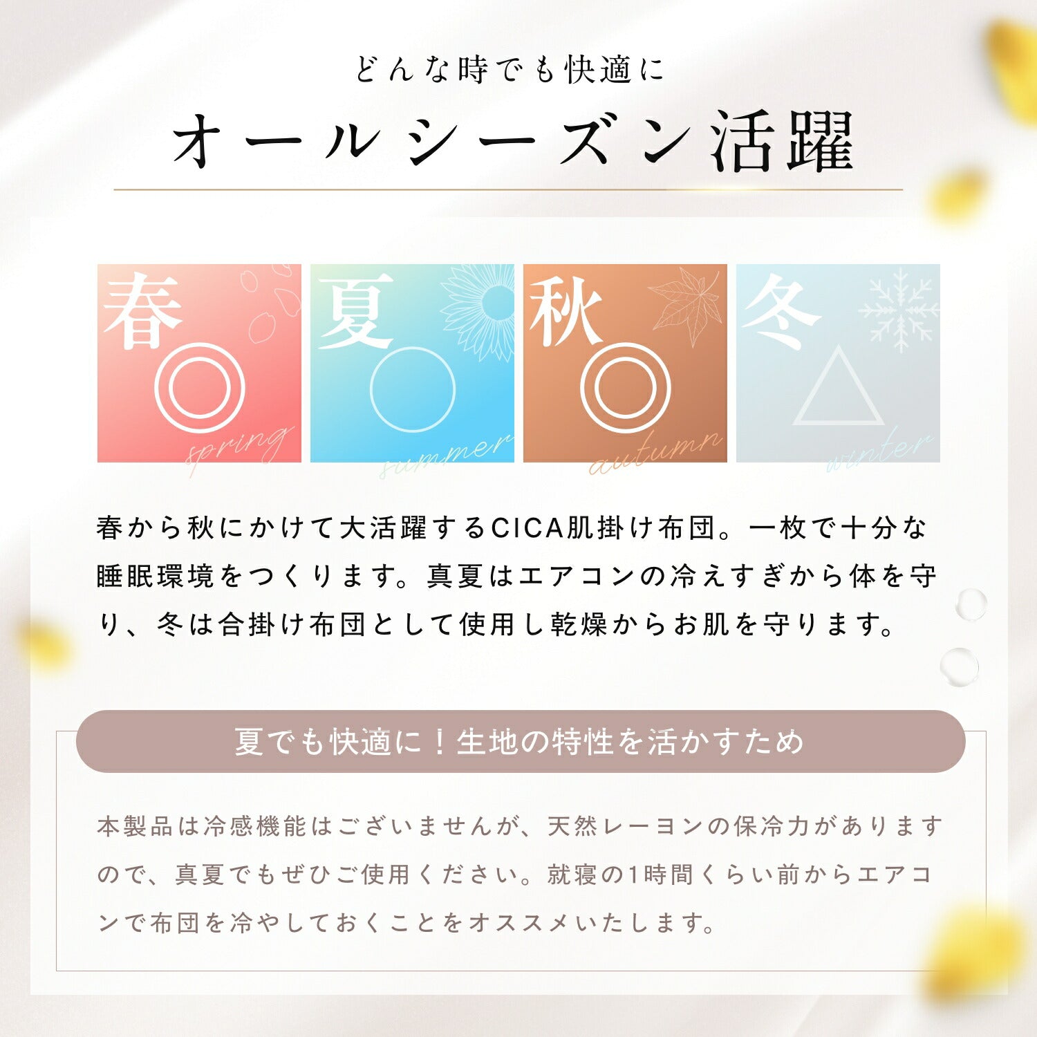 クレープ状にした高級レーヨン素材に美容商品にも多く使われているCICA(シカ)を施し、中には独自のふんわり軽やかな長繊維中綿でできていますため、滑らかさともちっりとした感触が実現。程よく厚さ、軽量なのに、やさしい重量感でカラダ全体をしっとりモッチリと包み込み、快眠へ導きます。
