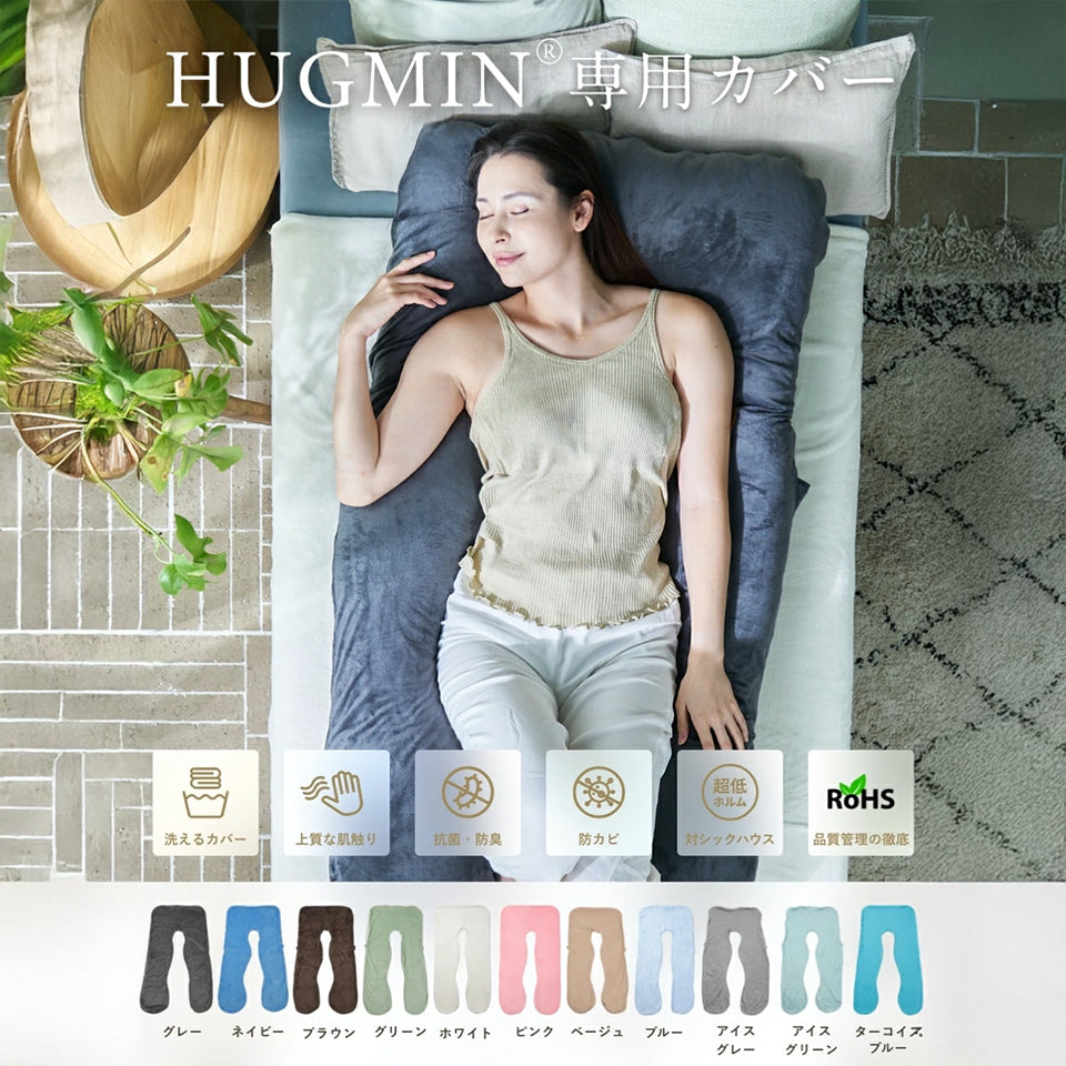 HUGMINはカラダ全体をやさしく包み込み頭・首・肩・腕・背中・腰を支え「理想の寝姿勢」へとサポート。